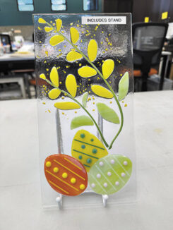 Need a last–minute gift to brighten any gathering for Easter Sunday? Come by the Creative Arts building and check out the many glass pieces available to give as lovely hostess gifts or to become one of your own treasures to enjoy for holidays to come. Feel free to come into the Glasshoppers Studio and let someone know you would like to take a closer look or make a purchase from the wonderful items for sale in the Glasshoppers’ window.
