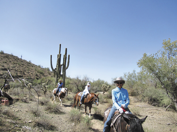The SaddleBrooke Ranch Riding Group enjoyed a final ride before the start of the summer hiatus on April 5 at Donnelly’s D-Spur Ranch in Gold Canyon just east of Apache Junction. It was a perfect day of nice weather and clear blue skies. The group was fortunate in seeing some of the Texas Longhorn cows raised on the land around the stable with their young calves. There was also a gila monster out sunning himself near the trail. Of course, there was the magnificent view of the Superstition Mountains as well as surrounding mountain ranges in the area and the ocotillos were in bloom already.