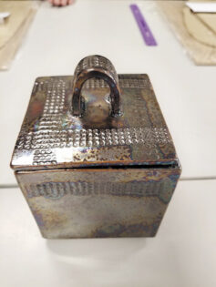 Larry Kosiba offered a class on lidded box construction to students of all skill levels at the SaddleBrooke Ranch (SBR) pottery studio. Participants learned the step-by-step process of building both the base and a matching lid. The class focused on the technical skill of making sure the lid fits perfectly.