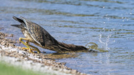 The Green Heron is a relatively small, dark, compact wading bird with a crested head. Usually, they are found in wetland thickets throughout much of North America. If you carefully observe it, you will see it stalking slowly along the edge of our pond, mostly in a crouched position, waiting for fish in the shallow water. When their prey is seen, it captures it with a darting stroke of the head and neck, often with a body lunge. They generally grasp their prey with their bill but may sometimes spear it.