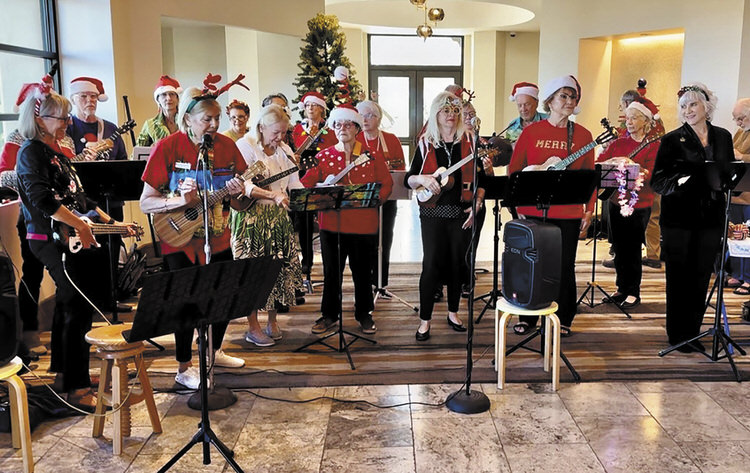 Continuing a musical tradition! If you happened to hear the SaddleBrooke Ranch (SBR) Ukulele Club play at holiday events around the ranch last month, you probably couldn’t help but join in the Christmas and Chanukah cheer. In November and December of 2025, the SaddleBrooke Ranchuleles led holiday songs at the SaddleBrooke Ranch Arts and Craft Fair, as well as the December Women of Wine gathering. We’re not sure who enjoyed it more—the ukulele players or the listeners!
